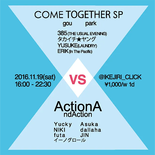 Event Top Event Come Together SP VS Action And Action Come Together SP VS Action And Action Information 2016.11.19 (Sat) Start: 16:00 / End: 22:30 池尻CLICK ¥1,000 with 1 drink Google Calendarに登録する Member YuckyAsukadallahaNIKIfutaJINイーノグロール Share Posted: 2022.1.8 (Sat) Last Update: 2022.4.25 (Mon)